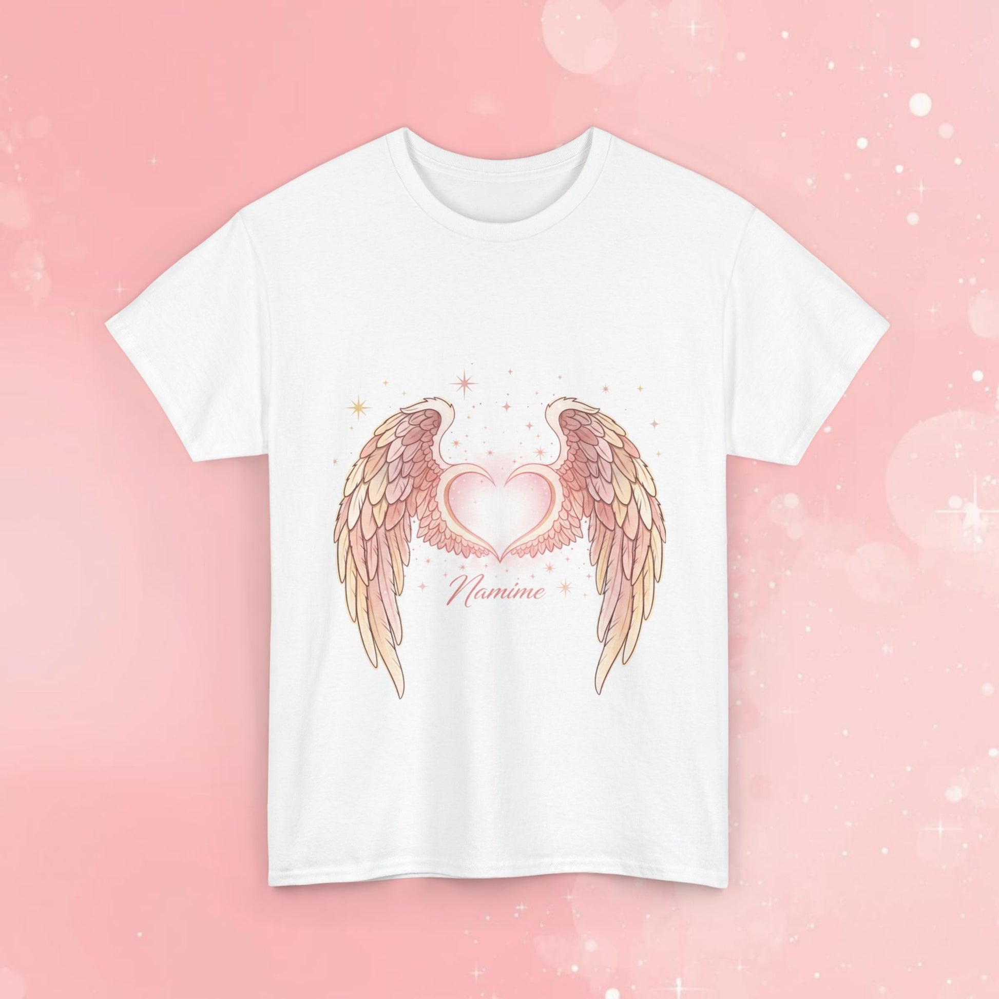 A soft, timeless cotton tee that carries a gentle, hopeful vibe. The front features delicate, watercolor-style angel wings cradling a glowing heart, rendered in warm pinks and golds with tiny star accents — subtle enough for everyday wear, expressive enough to feel personal. The classic crew neck and relaxed fit sit comfortably whether you’re layering under a jacket or wearing it solo on a quiet morning. It feels like a quiet note of comfort: wearable, breathable, and easy to move in. The printed inner neck and sleeve details are sharp and long-lasting, and the tear-away label keeps the back of your neck irritation-free. This shirt suits someone who likes soft, sentimental visuals and wants clothing that feels like a gentle statement rather than loud branding.